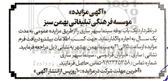 موسسه فرهنگی تبلیغاتی بهمن سبز در نظر دارد یک باب بوفه سینما سپهر ساری را از طریق مزایده عمومی به مدت یک سال به اجاره واگذار نماید. جهت کسب اطلاعات بیشتر و دریافت فرم مزایده از ساعت 15 الی 21 به سینما بهمن بهشهر به نشانی ذیل مراجعه فرمایید.